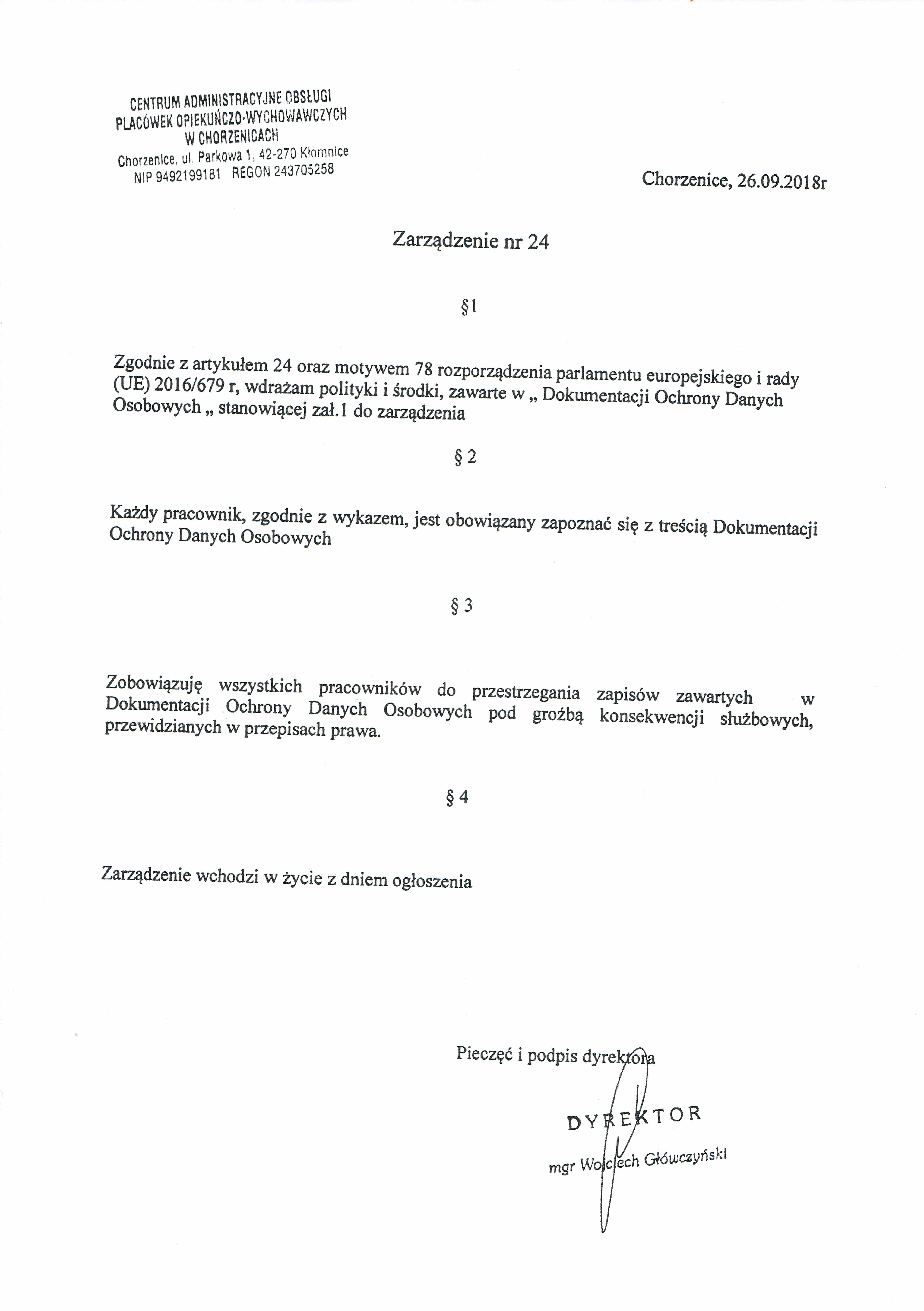 - Zarządzenie - wdrożenie dokumentacji ochrony danych
